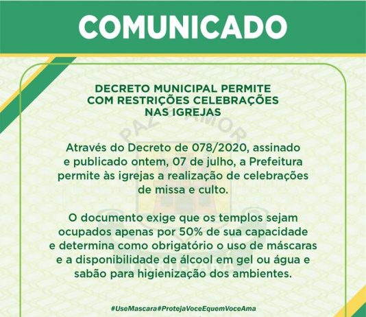 DECRETO MUNICIPAL PERMITE COM RESTRIÇÕES CELEBRAÇÕES NAS IGREJAS