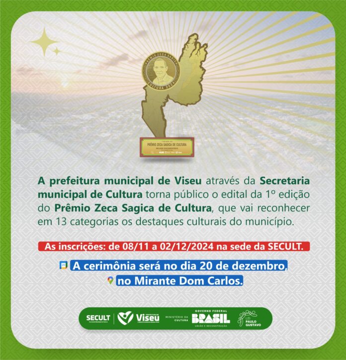 A Prefeitura Municipal de Viseu, por meio da Secretaria Municipal de Cultura, torna público o edital da 1ª edição do Prêmio Zeca Sagica de Cultura, que irá reconhecer, em 13 categorias, os destaques culturais do município, incluindo documentário, videoclipe, melhor quadrilha junina, melhor música, entre outros.