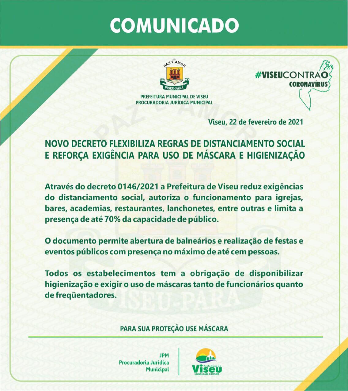 Através do decreto 0146/2021 a Prefeitura de Viseu reduz exigências do distanciamento social, autoriza o funcionamento para igrejas, bares, academias, restaurantes, lanchontes, entre outras e limita a presença de até 70% da capacidade de público.