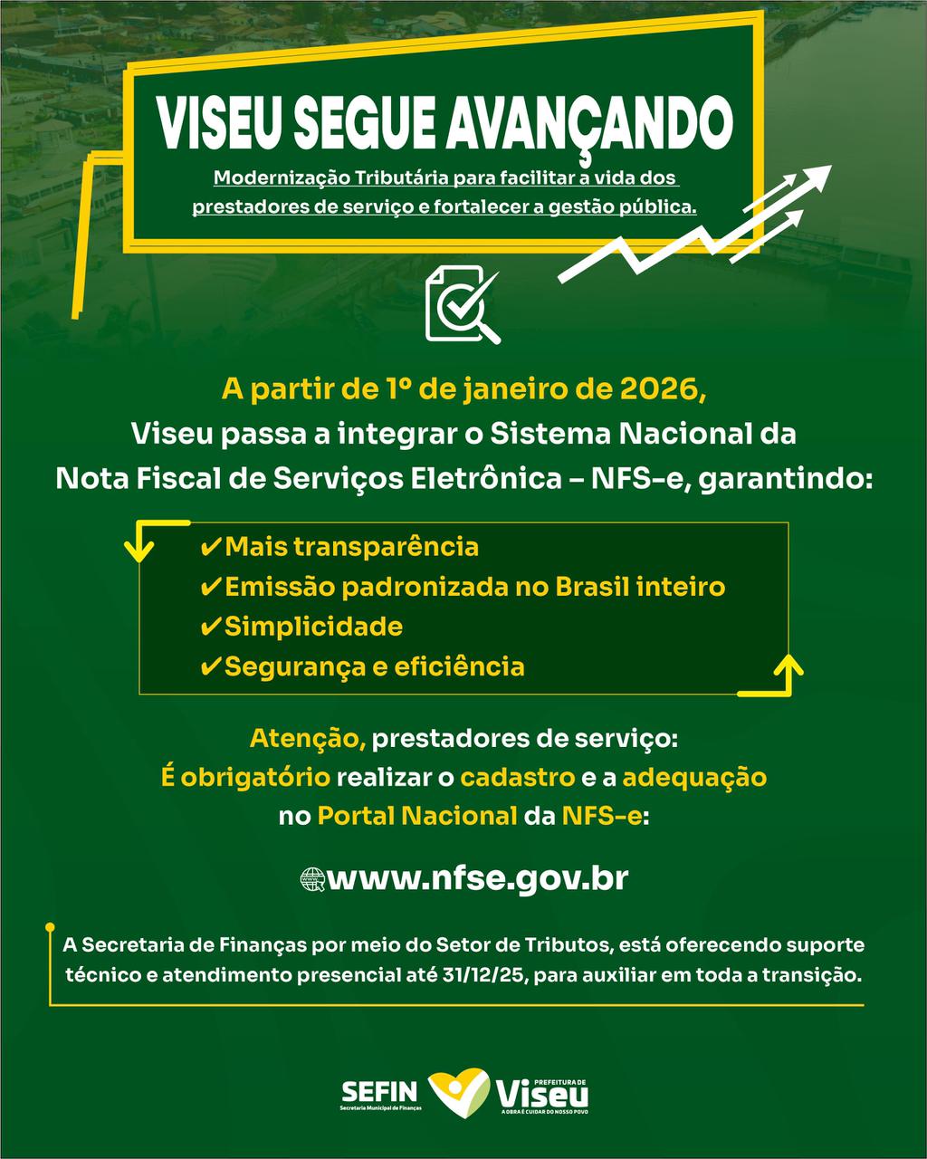 A partir de 1º de janeiro de 2026, a Prefeitura Municipal de Viseu — por meio da Secretaria Municipal de Finanças / Setor de Tributos — aderirá ao Sistema Nacional da Nota Fiscal de Serviços Eletrônica (NFS-e), em conformidade com a Lei Complementar nº 214/2025 (Reforma Tributária).