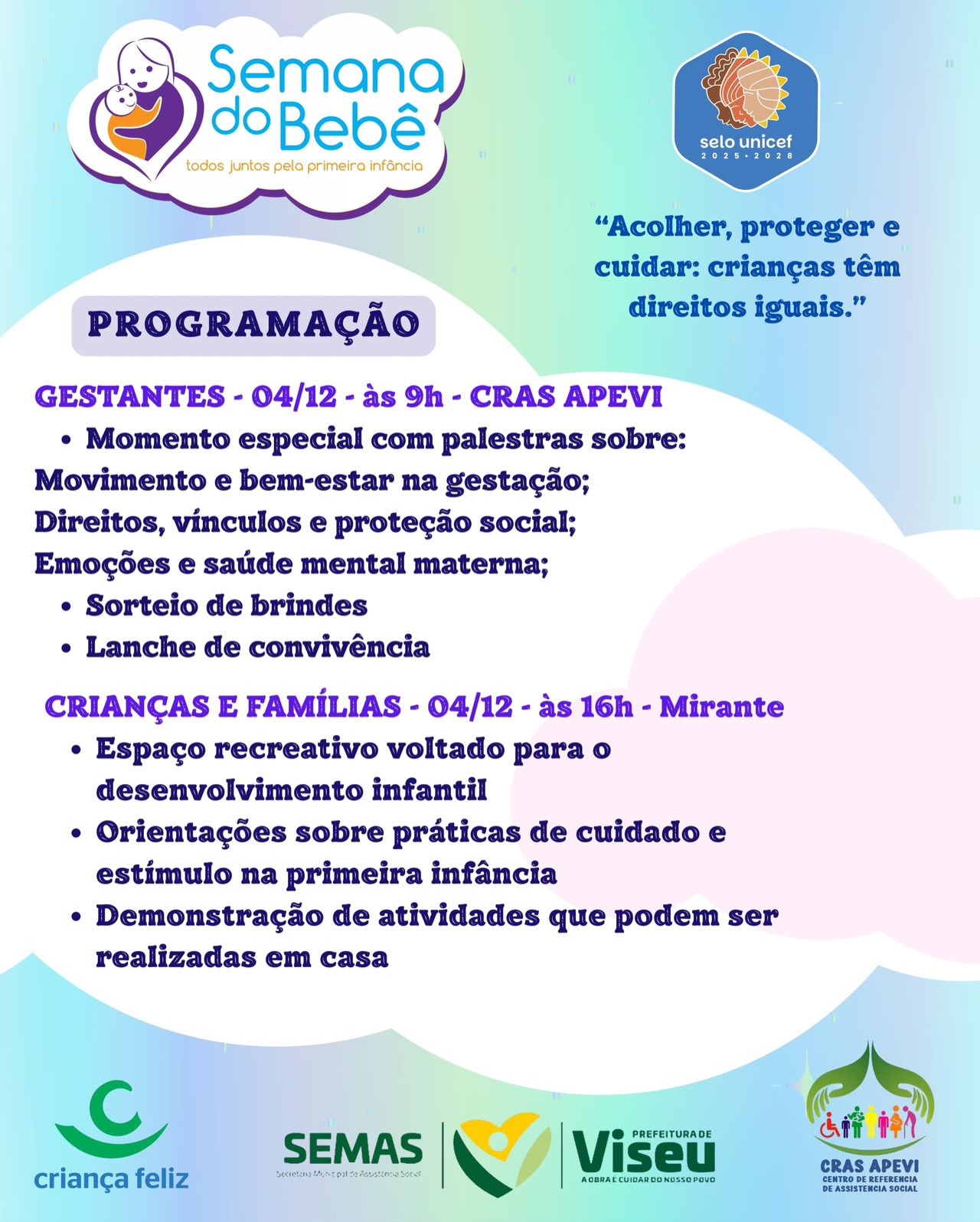 Com o tema “Acolher, proteger e cuidar: crianças têm direitos iguais”, nossa programação segue com atividades especiais, palestras, orientações, momentos de convivência e muito carinho para as famílias viseuenses.